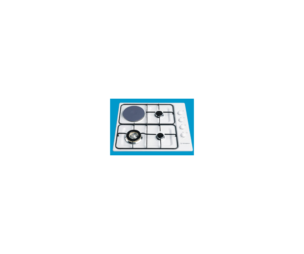 GHH18W white enamel dual fuel square cooktop with cerashield solid electric hotplate, two gas burners, wok burner with electronic ignition.