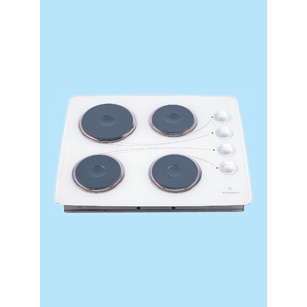 A white, square electric cooktop with a toughened glass surface and four cerashield hotplates. The edges are curved, with no trim.