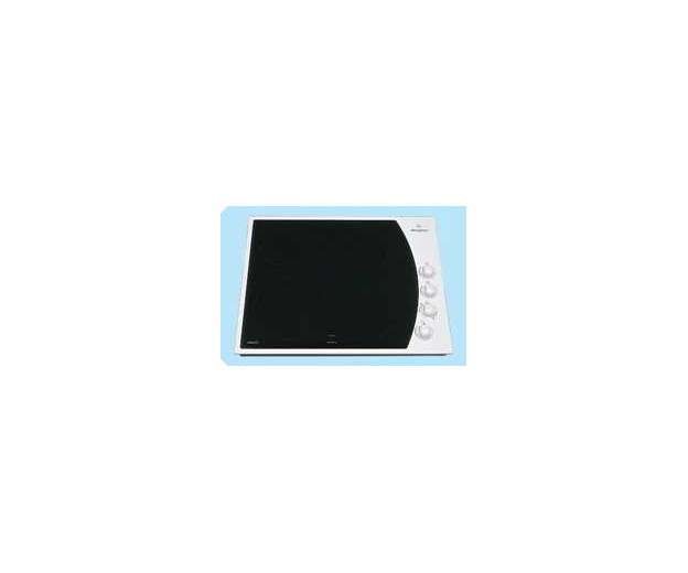 A square, ceramic cooktop with a white trim, with four quick response elements which includes one dual circuit element.