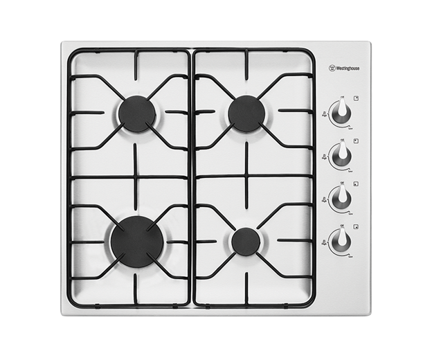 60cm stainless steel gas cooktop with FamilySafe (TM) trivets and easy ignite under knob ignition.