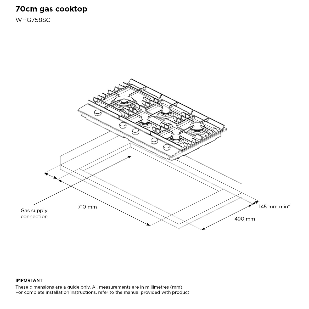75cm 5 burner stainless steel gas cooktop with a high powered, intense 19 MJ/h wok burner, dual valve flame control and cast iron trivets.