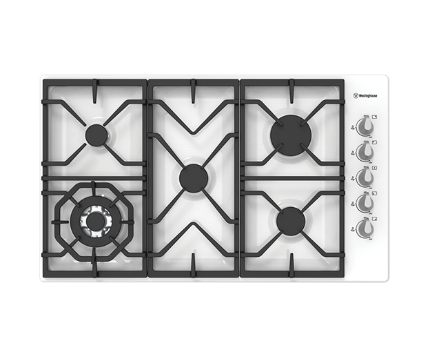 5 burners incl. wok/high power burner, electronic ignition, cast iron trivets, easy clean white enamel.