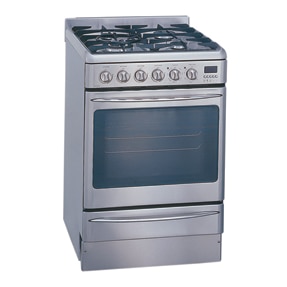 DSJ638S 600mm stainless steel dual fuel freestanding integrated cooker with a 82 litre multifunction 6 electric oven and 4 burner cooktop with wok and flame safety valves, also features an electronic program timer and defrost function.