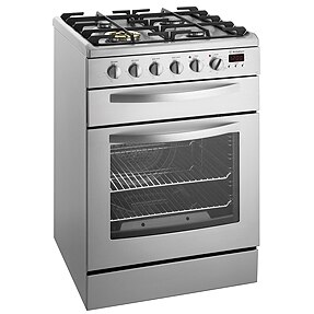 GSN627S stainless steel 80 litre gross capacity 600mm freestanding integrated oven with with integrated electronic ignition, separate electric grill, 4 gas burner cooktop and programmable timer.