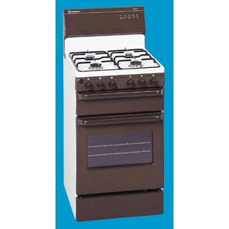 GUG511B Hakea gas upright with 4 sealed to hob burners, two piece enamel trivets, sealed hob, slide-out grill, window oven door, piezo ignition and brown oven/grill doors and trim.