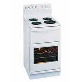PAJ143W conventional 540mm upright range with oven light, separate grill, 60 minute timer, 4 radiant hotplates and lift off enamel door with window.