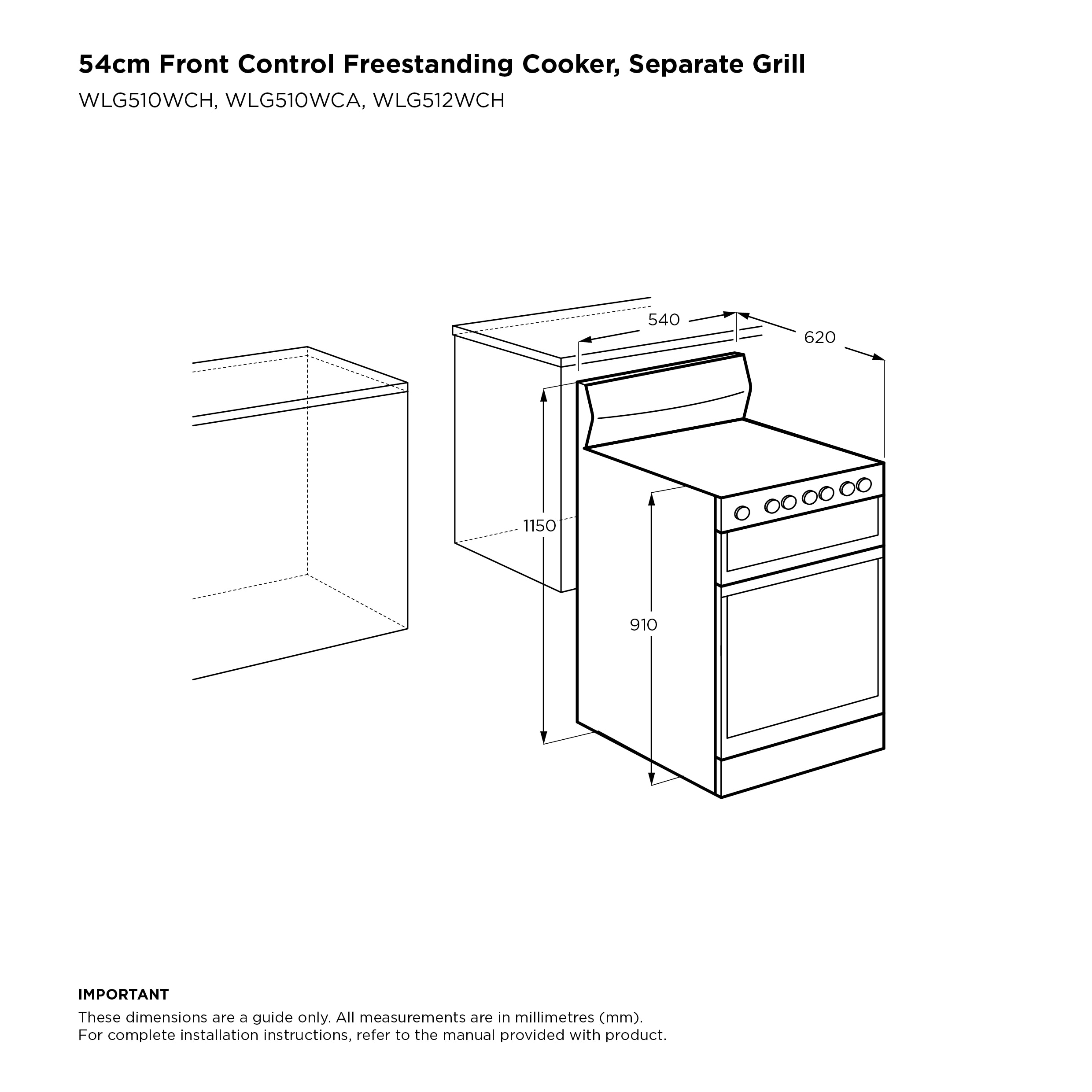 54cm white gas freestanding oven with separate gas grill, gas oven with fan bake, 60 minute timer and a 4 burner gas cooktop with 14.2 mj/hr wok burner. LP conversion kit included.