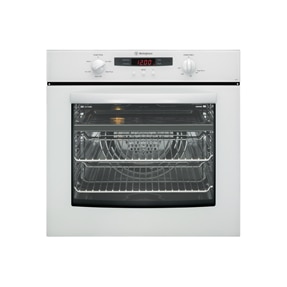 A multifunction, electric, white single Boss (Tm) oven, 5 cooking functions, 2 scone trays and program timer.