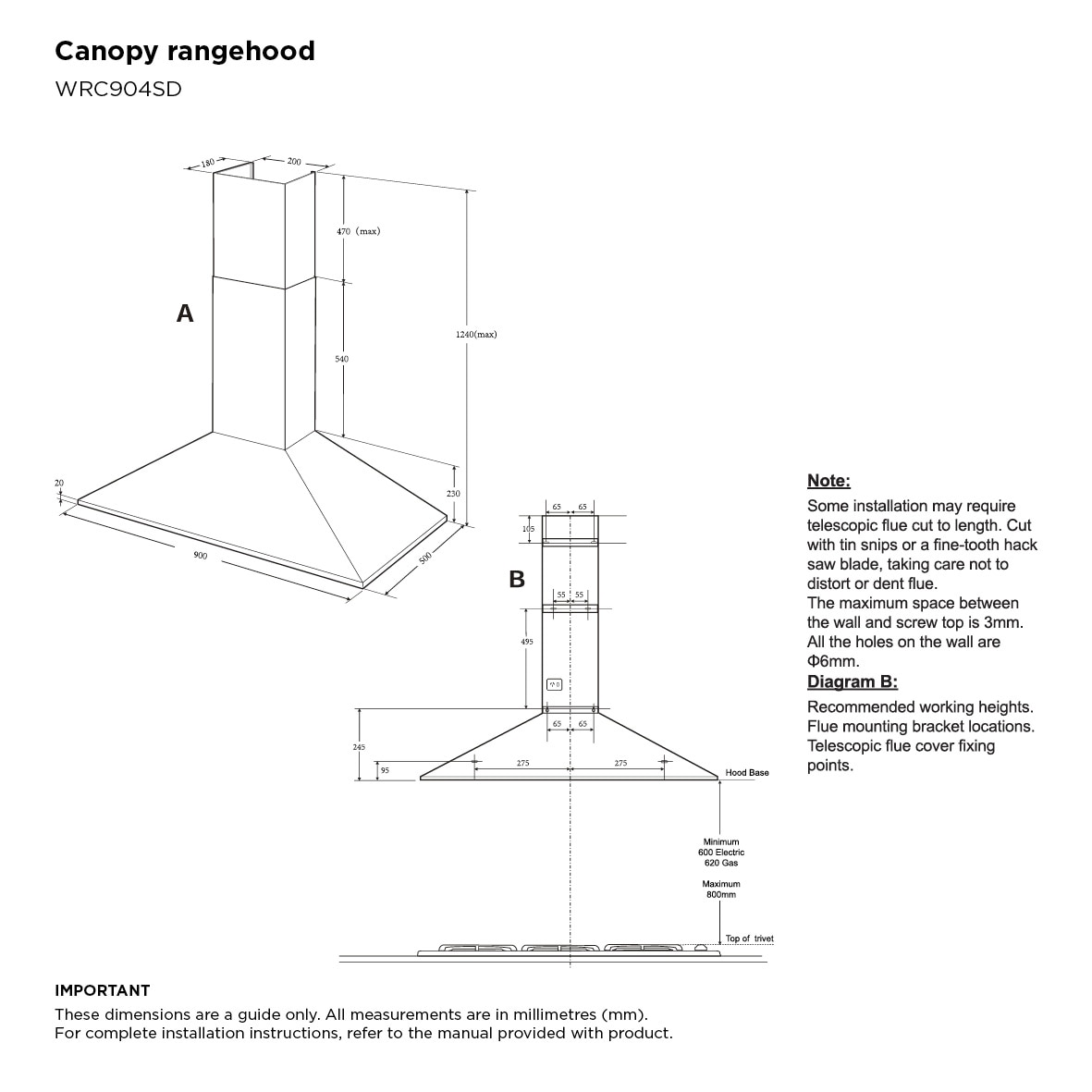 90cm canopy rangehood with 670m3/h extraction rate, LED lighting, 3 fan speed, and dishwasher safe filters.