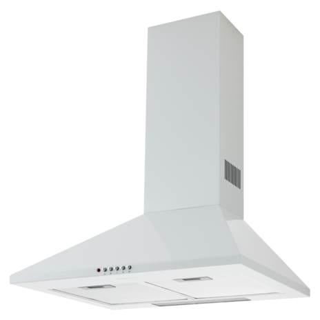 A white canopy rangehood with 2 fans, 3 speeds, 600mm in width and push button controls.