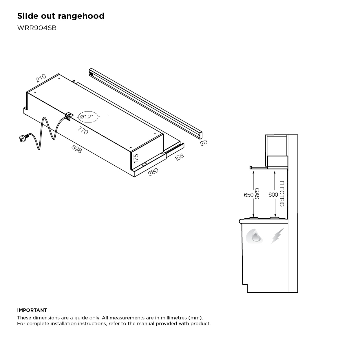 90cm slide out stainless steel trimmed rangehood with 2 fans, 3 speeds and top recirculating option.