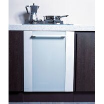 SB947AH dishwasher with aluminium finish trims and interchangeable central glass door panel, 12 place settings, electronic push button controls that are tucked away on the top of the door, and 4 wash programs.