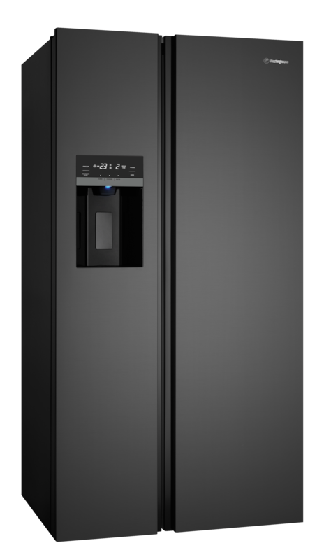 596L side by side fridge, matte black, with plumbed ice & water door dispenser, fruit & vegetable boxes and 4.5 stars energy rating.